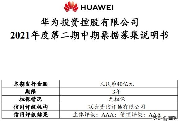 就在昨天(3月1日),华为宣布将发行今年的第二期中期票据,计划发行40亿元,期限为3年,发行日期3月3日至4日。此前的1月29日,华为发行了第一期中期票据,金额同样为40亿元。也就是说,一个多月,华为两次发债,在国内总融资规模达80亿。