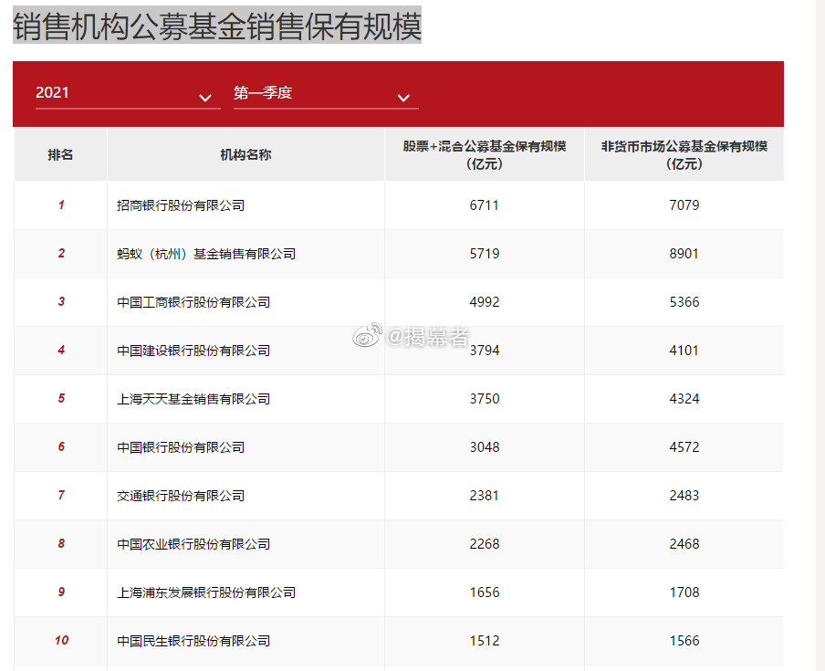 中基协今天公布了2021一季度销售机构公募基金销售保有规模,各大渠道的核心数据被披露,银行依然是主渠道,招行、工行、建行、中行、交行坐稳五霸主。