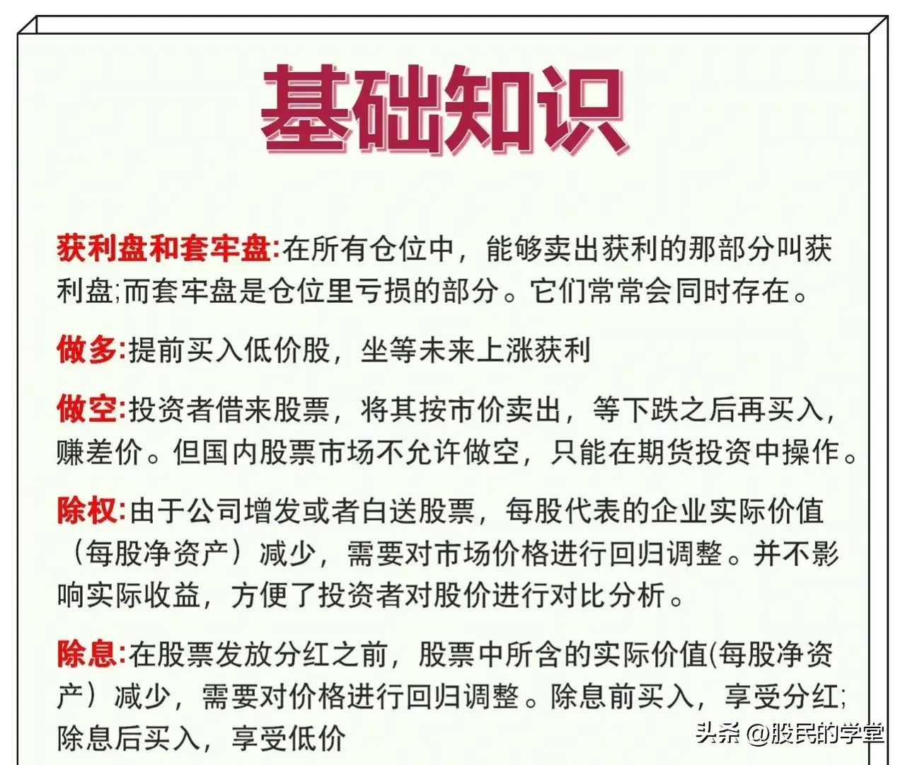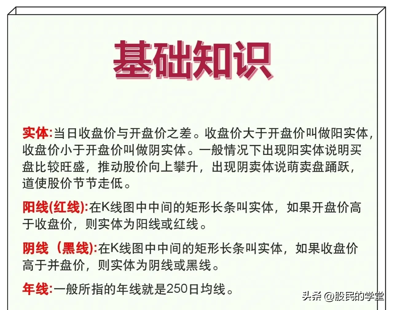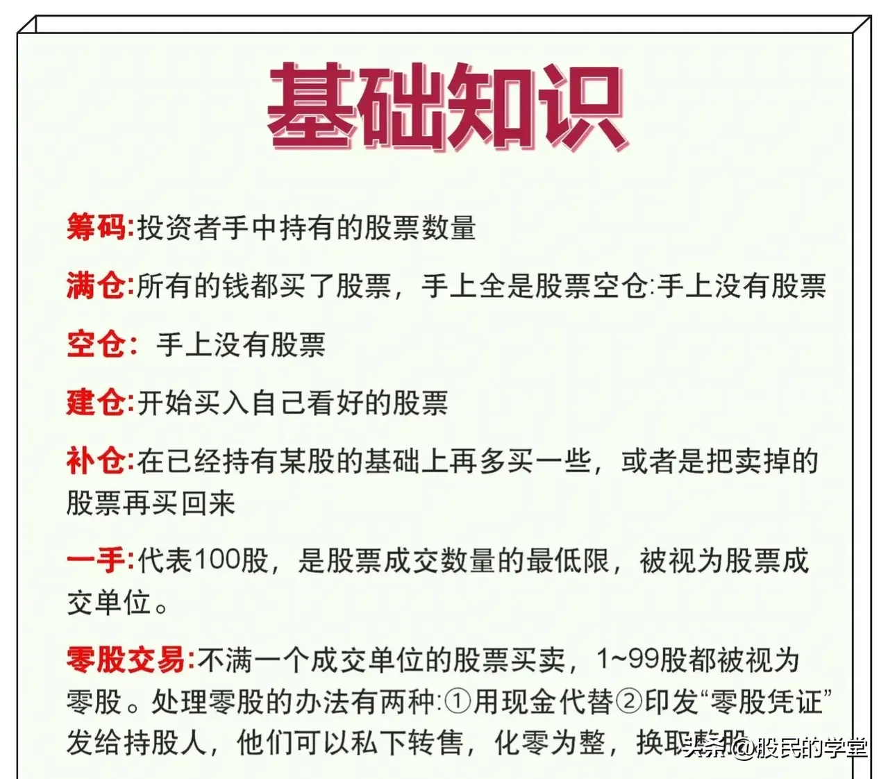 一分耕地,一分收获,炒股15年以来,我发现在股票知识上付出的精力越多,收获自然也是越多的,炒股不仅仅靠的是一时的运气,而是我们的认知,俗语说的好:“基础不牢,地动山摇”,今天把股票基础大全整理完了,分享给大家,建议收藏转发!