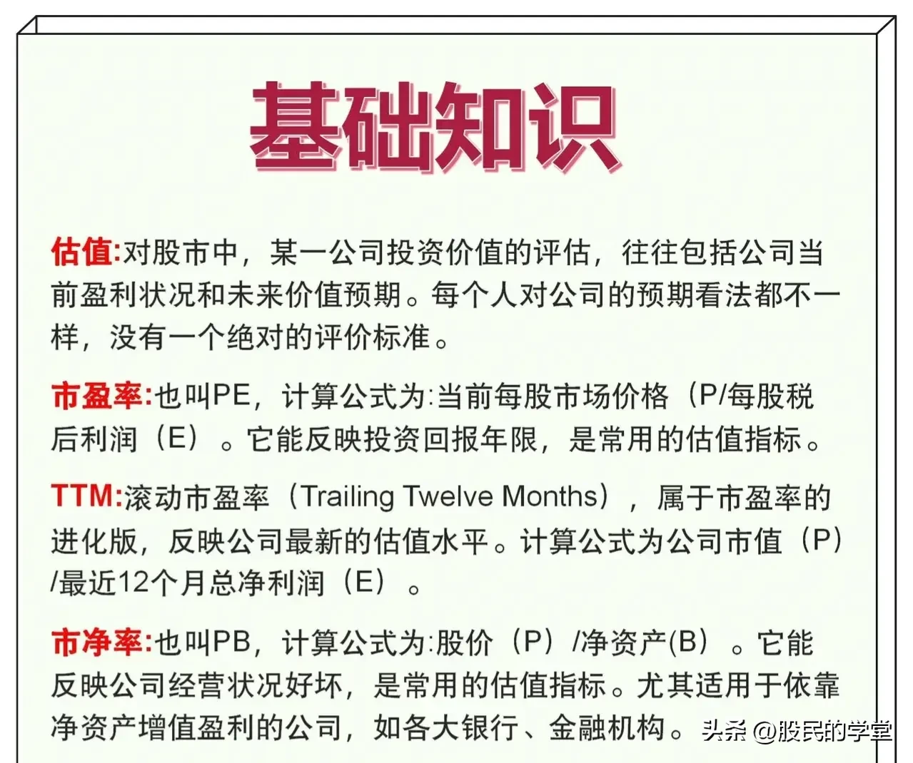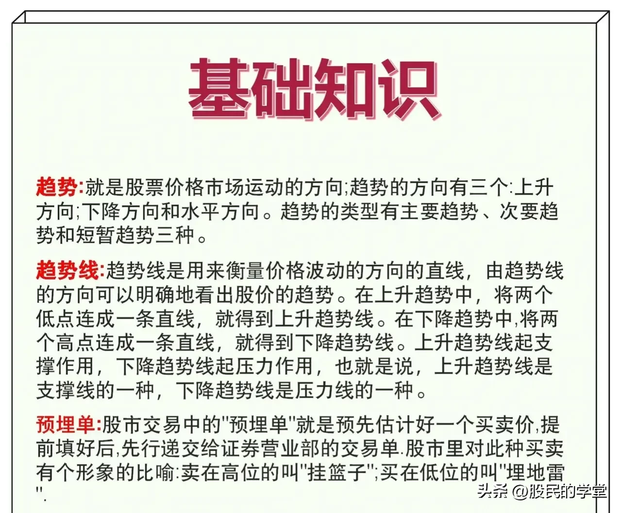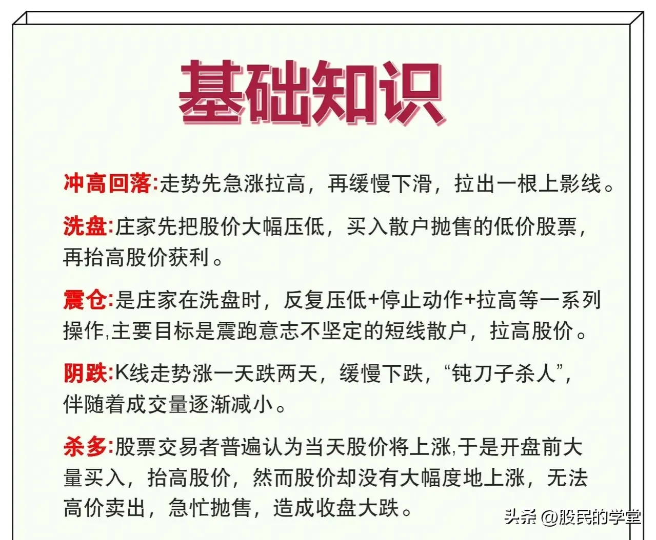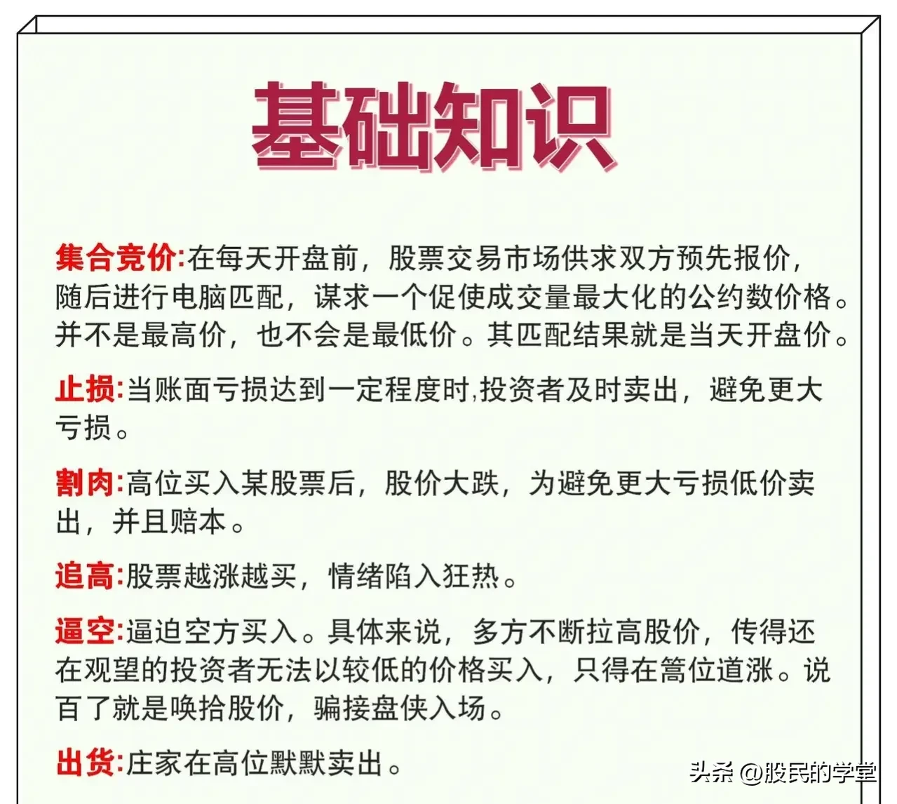 一分耕地,一分收获,炒股15年以来,我发现在股票知识上付出的精力越多,收获自然也是越多的,炒股不仅仅靠的是一时的运气,而是我们的认知,俗语说的好:“基础不牢,地动山摇”,今天把股票基础大全整理完了,分享给大家,建议收藏转发!