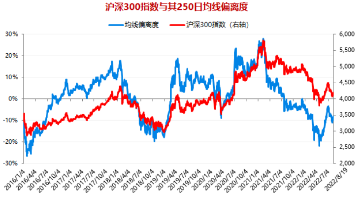 2、一般看中长期均线偏离度,如250日均线,它也是一条牛熊分界线。目前沪深300指数向下偏离其250日均线的幅度为9%,仍是向下偏离,且偏离幅度较大,表明股票仍具有性价比,可以继续持有权益类资产。