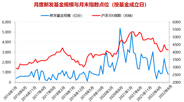 2、2021年2月以来,新基发行规模急剧缩水,今年4、5月份基金发行热度几乎处于2016年以来最低,随着市场在4月份触底反弹,基金发行市场也开始回暖。8月份至今已成立72只基金,共计发行788.61亿份。整体看,发行热度仍是2016年以来的较低水平,可见基金市场投资者的情绪仍然较为低迷,市场距离过热还有很远的距离。