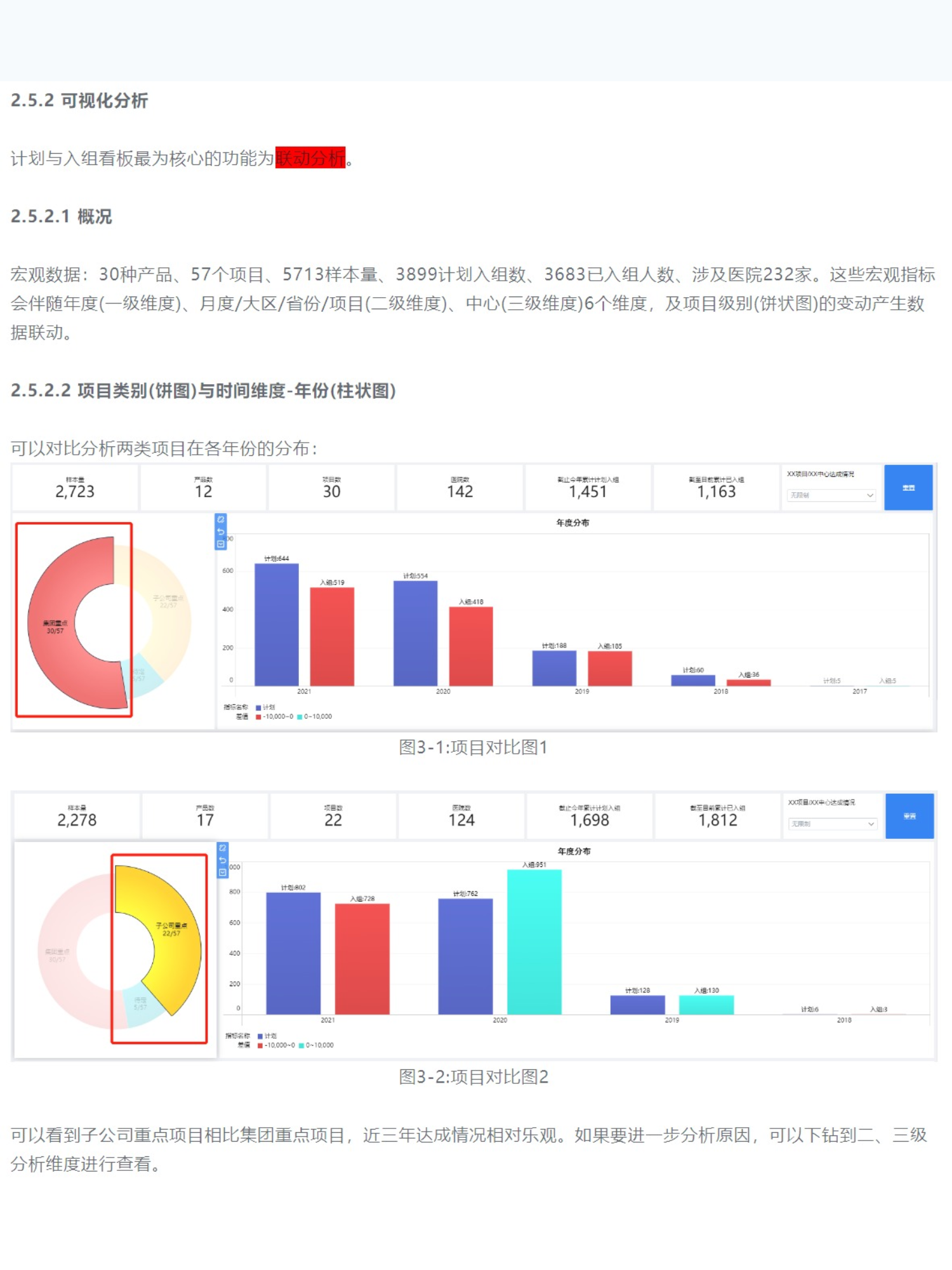 项目类别(饼图)与时间维度-年份(柱状图)