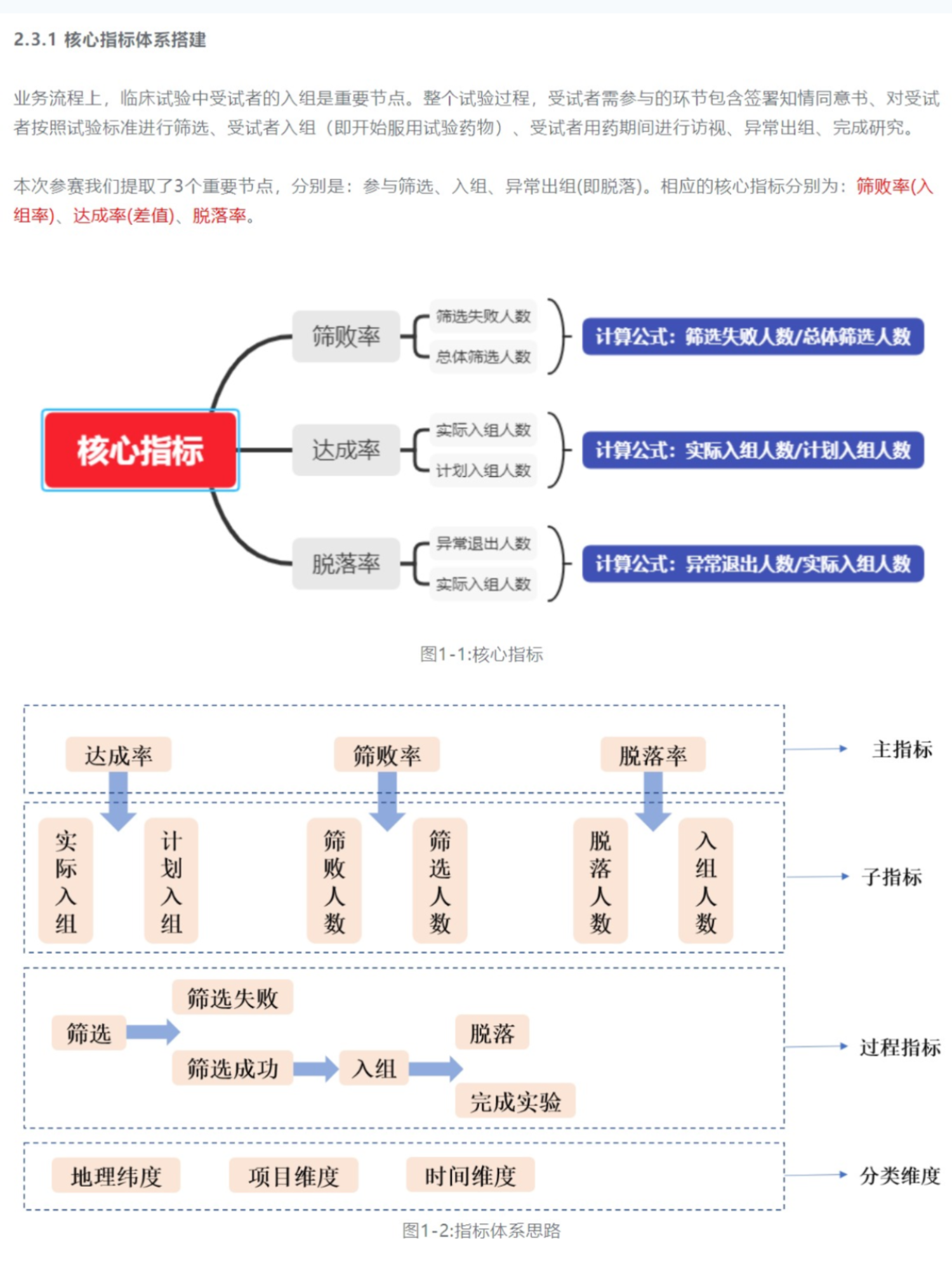 核心指标体系搭建:筛败率(入组率)、达成率(差值)、脱落率。