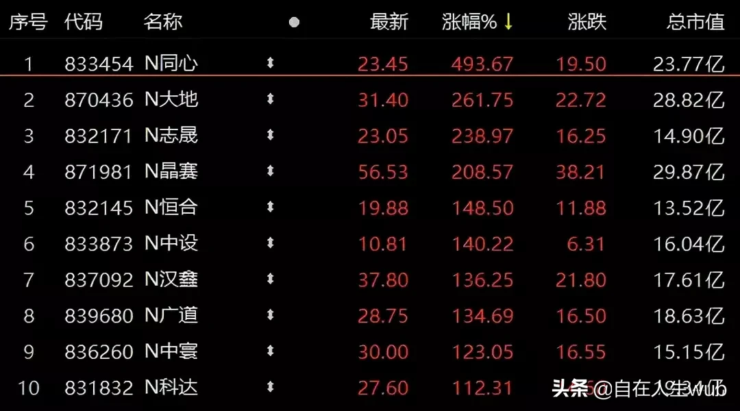 #北交所开市#今天,是北京证券交易所开场首秀日,首批81家上市公司亮相北交所。其中,包括10支新股,和71家存量新三板精选层平移过来的公司;71支平移股表现平平没啥可说的,而10只新股当日涨幅均超100%,最高的是N同心涨幅接近500%!
