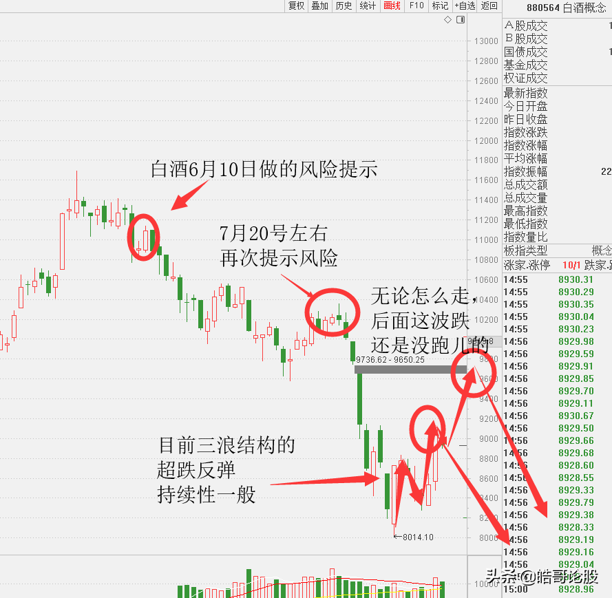 昨天白酒板块午盘后直线拉升,推动指数大涨。该板块从早前的6月10号,和7月20左右都明确做过风险提示。白酒板块也不出意料走出空头趋势,近两周白酒板块走出三浪的调整结构,这属于明确的超跌反弹,目前仍不看好它的持续性!