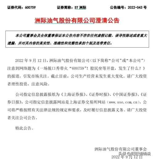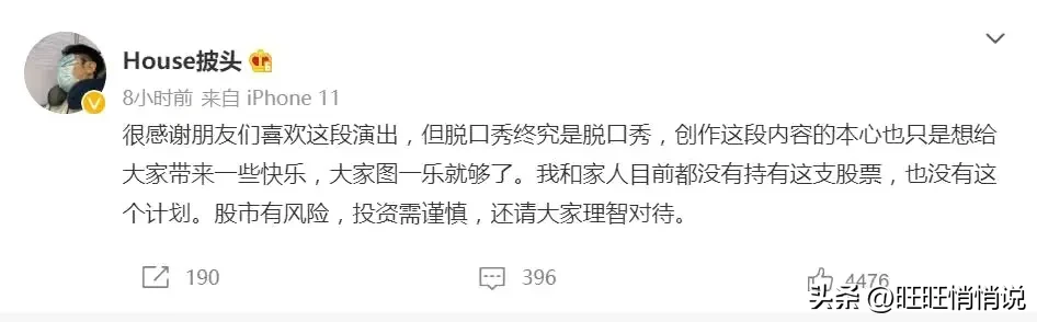 而这一切才刚刚是开始,这个事情,最终还是逼得HOUSE和ST出来澄清。HOUSE说,脱口秀仅仅是脱口秀,说白了就是段子,自己和家人并没有持有这只股,希望大家谨慎投资。同时ST洲际也赶紧发文,宣称公司经营并没有发生重大变动,希望大家理性。