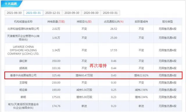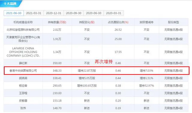 2021年六月(图八)香港中央结算继续增持,持股比例0.46%,静待拉升!话说薛红新真能拿啊,持仓时间近一年半时间,真的是一动不动,股民们要学习!