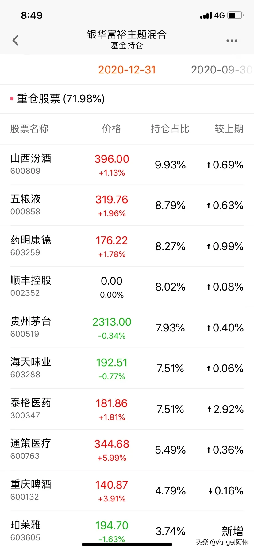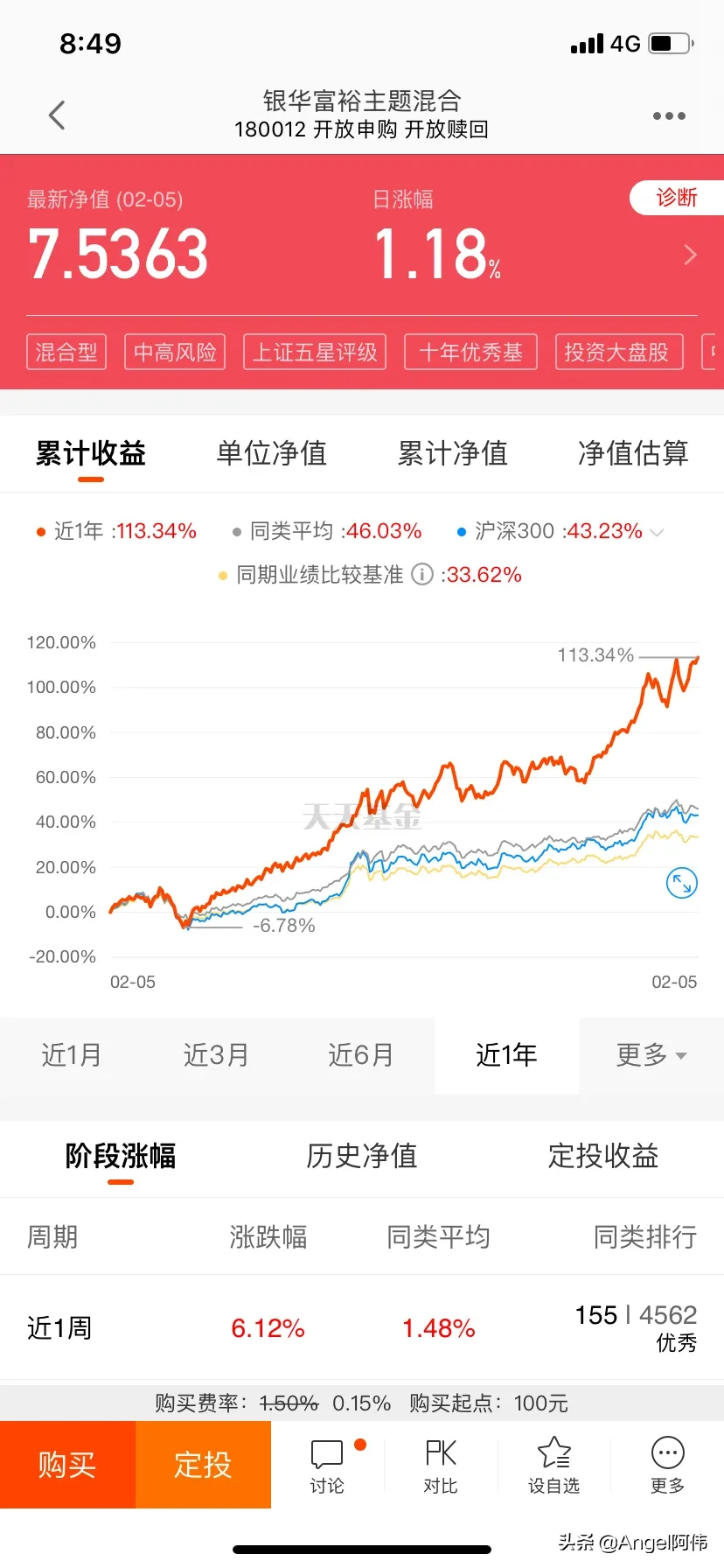 2.银华富裕主题混合,代码180012,混合型,中高风险,最新净值7.5363。在持仓,和重仓持股方面,主要以白酒为主,其次医疗医药和其他。其中白酒占比26.65%,医疗医药占比21.27%,其他混合占比24.06%。该基金成立时间,2006年11月16日,净资产规模173.62亿元。基金经理,焦巍,管理该基金时间,从2018年12月27日至今。任期回报242.53%,近一年涨跌幅+113.34%。