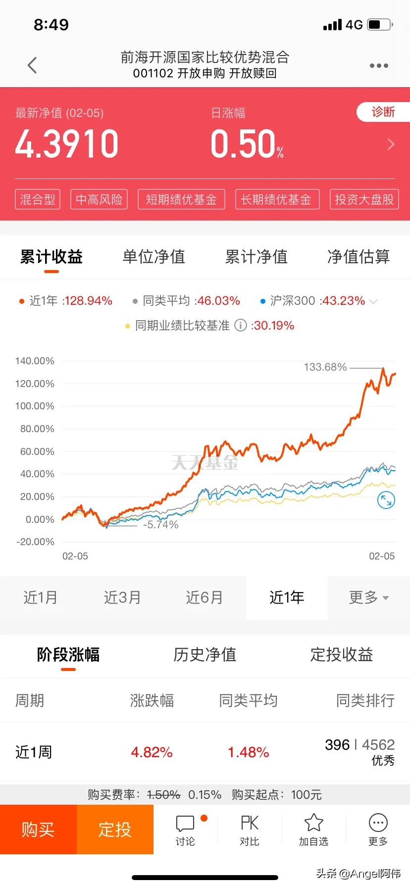 1.前海开源国家比较优势混合,代码001102,混合型,中高风险,最新净值4.3910。在持仓,和重仓持股方面,主要以白酒为主,其次医疗医药和其他。其中白酒占比25.89%,医疗医药占比28.18%,其他混合占比24.60%。该基金成立时间,2015年05月08日,净资产规模49.04亿元。基金经理,曲扬,管理该基金时间,从成立以来至今,一把手管理。任期回报339.10%,近一年涨跌幅+128.94%。
