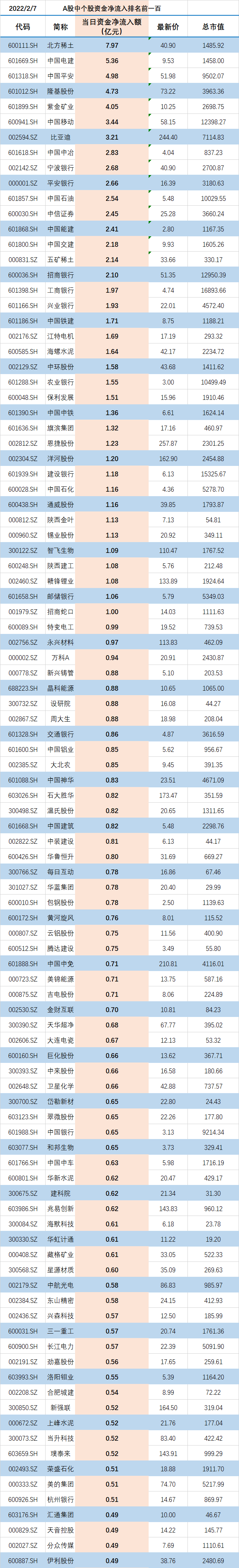 2022/2/7 A股中个股资金净流入排名前一百