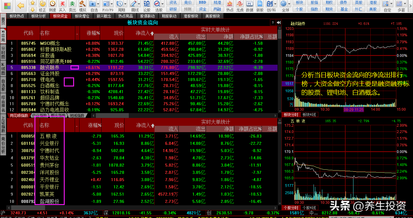 当日大资金做空的方向是融资融券标的股票、锂电池、白酒概念。
