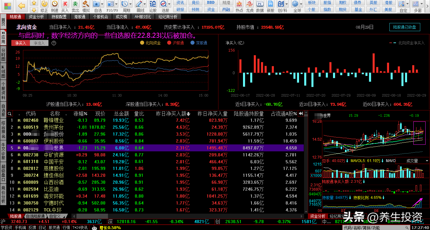 #众说低碳# 北向资金低位持续加仓新能源方向、数字经济方向,底部区域煤炭概念有建仓迹象(沪深股市复盘心得2022.8.29)