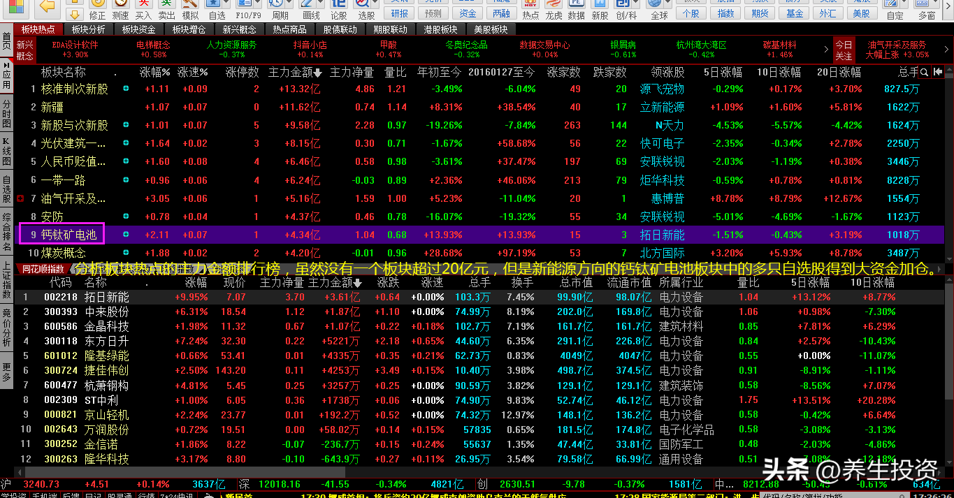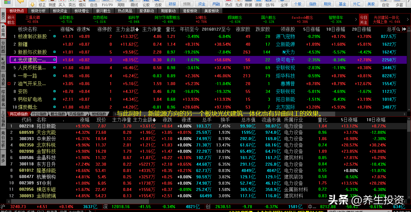 2、分析板块热点,主力资金做多方向:新能源方向的钙钛矿电池板块、光伏建筑一体化板块、煤炭概念板块。