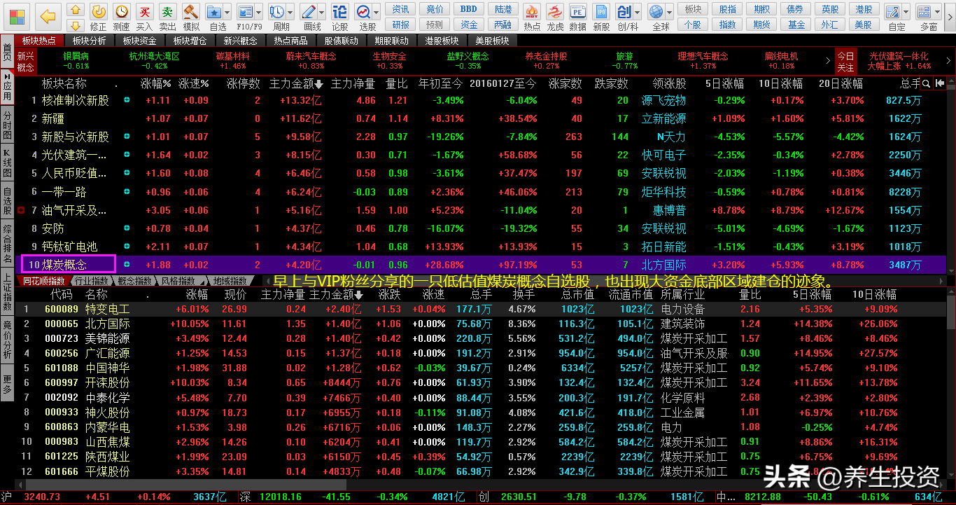 早上与VIP粉丝分享的一只低估值煤炭概念自选股,也出现大资金底部区域建仓的迹象。