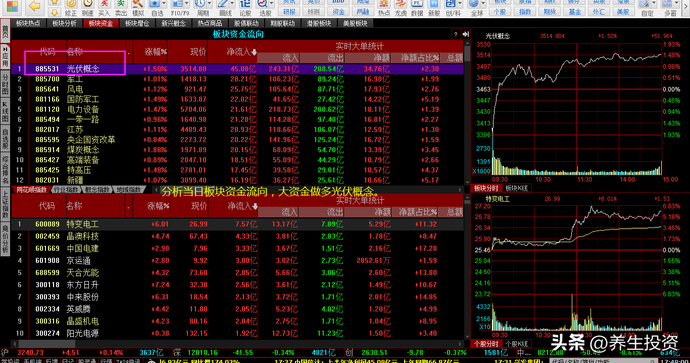 分析当日板块资金流向,大资金做多光伏概念。