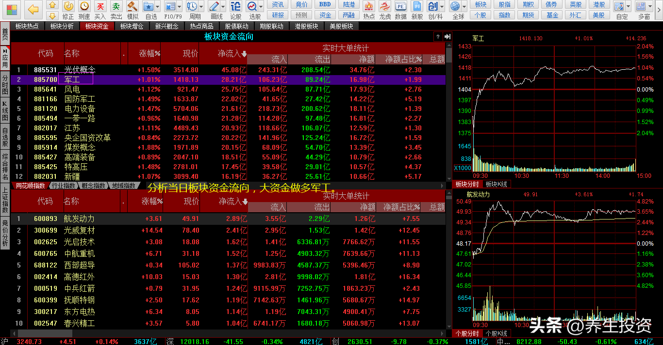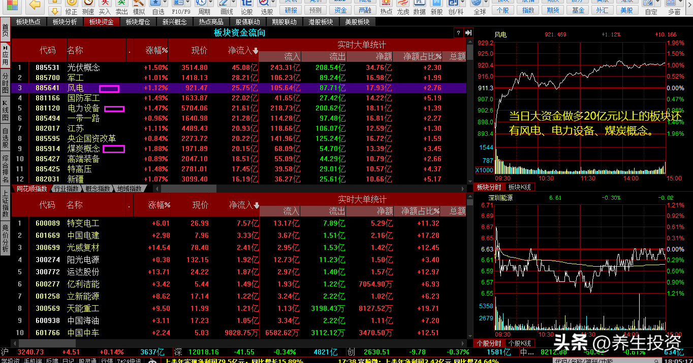 3、分析板块资金流向,沪深股市大资金做多:光伏概念、军工、风电、电力设备、煤炭概念。