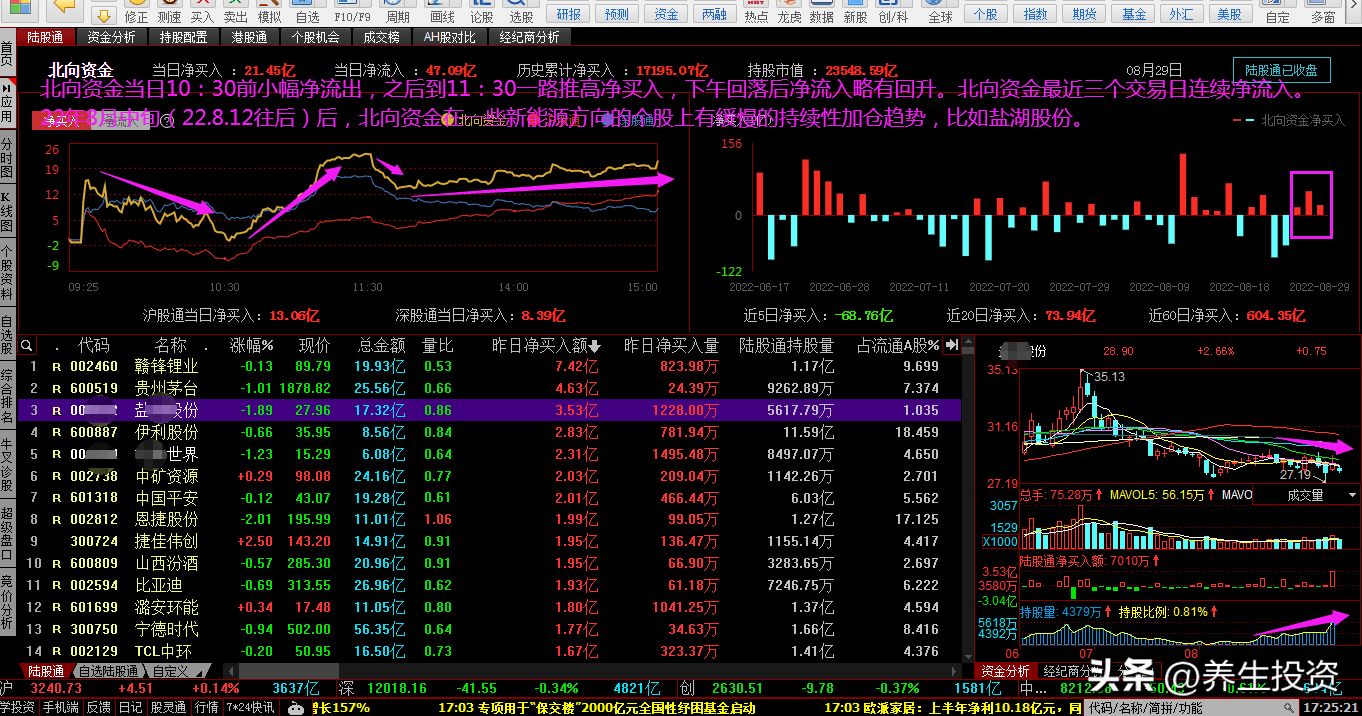 22年8月中旬(22.8.12往后)后,北向资金在一些新能源方向的个股上有缓慢的持续性加仓趋势,比如盐湖GF。