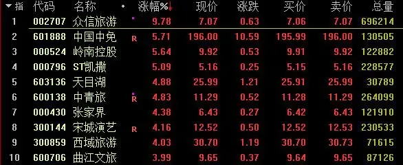 旅游板块也大涨逾8%,创3个月来最大涨幅。A股方面,众信旅游、中国中免、岭南控股等涨幅居前,中青旅、天目湖、张家界、西域旅游、曲江文旅等跟涨。