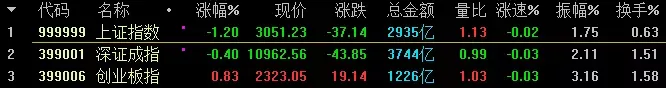 9月26日,早盘指数低开高走,午后指数再度回落,沪指走势较弱。截至收盘,沪指跌幅为1.20%,报收3051.23点,深成指跌幅为0.40%,报收10962.56点,创业板指涨幅为0.83%,报收2323.05点。成交额方面,沪市总成交2935.36亿,深市总成交3744.18亿。