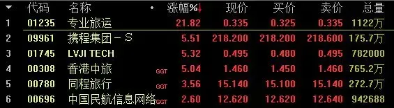 港股方面,专业旅运涨超24%,携程集团涨超8%,香港中旅涨超7%,同程旅行涨超5%。香港宣布防疫措施调整后,去哪儿平台上国际飞往香港的航线搜索量暴增。