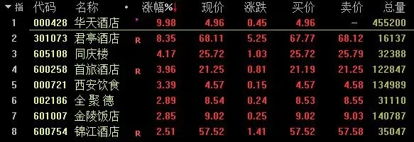 其中酒店餐饮板块放量飙升逾5%,板块内所有个股上涨,华天酒店直线拉涨停,君亭酒店、同庆楼、首旅酒店、西安饮食、全聚德、金陵饭店、锦江酒店拉升上涨。