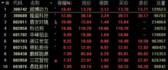新能源车板块中,越博动力涨超19%,隆盛科技涨超12%,盾安环境、科达利、华峰铝业涨停,浙江世宝、银轮股份、鹏辉能源等股跟涨。