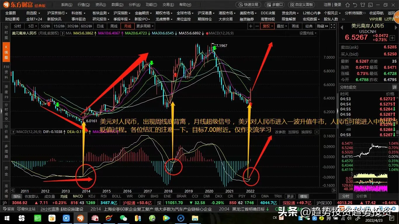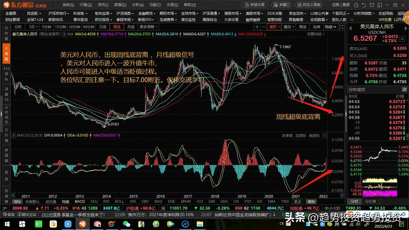 美元对人民币,再创本轮行情新高,提前一年预判,出现周线底背离 ,月线超级信号 ,季度线超级共振,美元对人民币进入一波升值牛市,不必担心人民币会出现大幅度贬值风险!仅作交流学习!