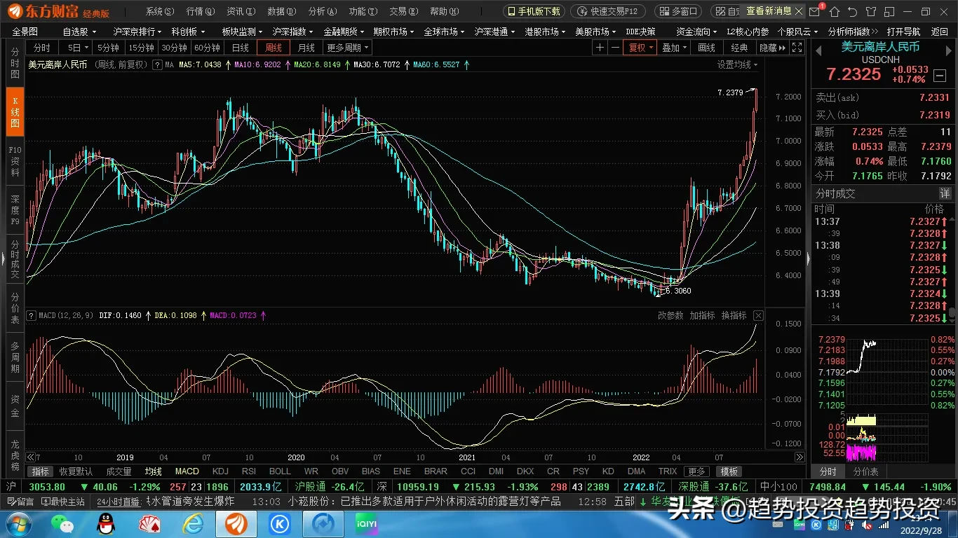 现在底部的核心资产指数也一样,淡定!离岸人民币兑美元自2020年7月以来首次跌破7.2关口。下一个轮到白酒消费医医药保险证券等核心资产!
