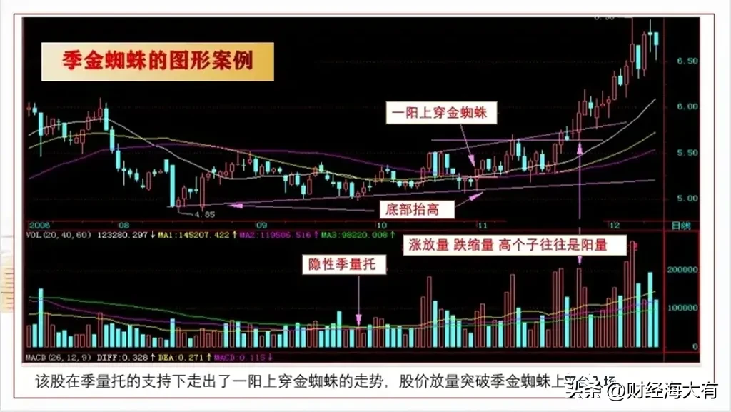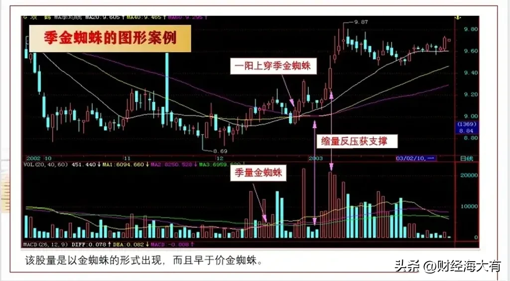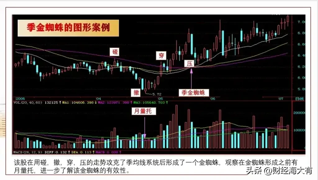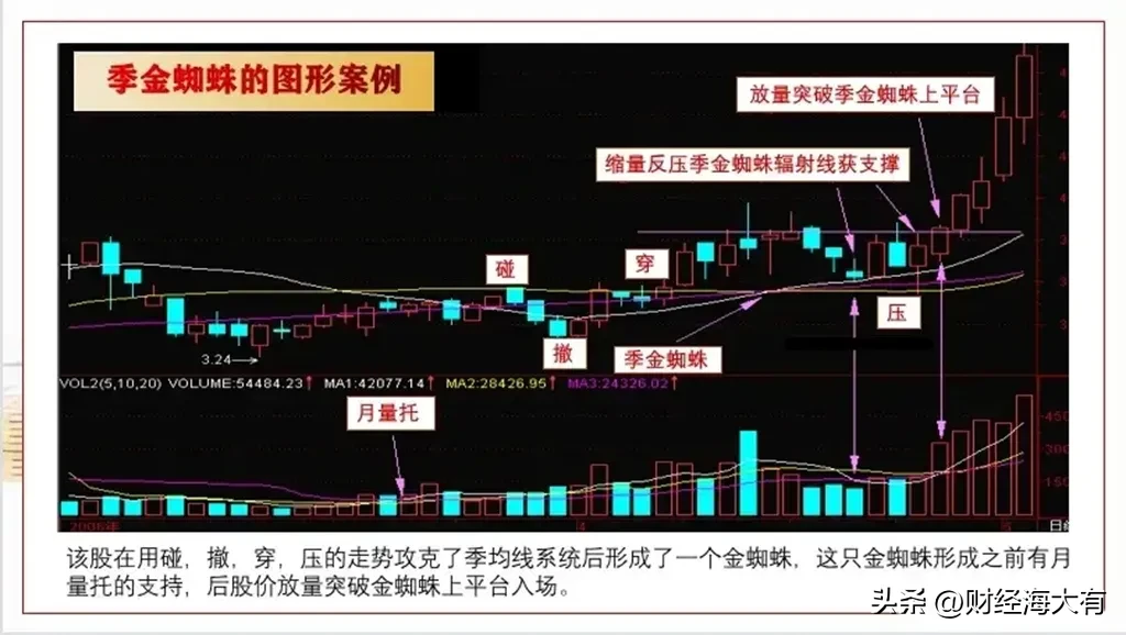 “金蜘蛛”图形因为均线成本发生了共振,所以对股价的支撑力比价托要更好一些,金蜘蛛一旦得到了成交量的支持,往往有上扬行情!所以发现金蜘蛛的同时如果能发现提前形成的量托,那么在金蜘蛛上的股价缩量反均线系统时是低吸的好机会,股价一日放量突破金蜘蛛上平台更应该入场。