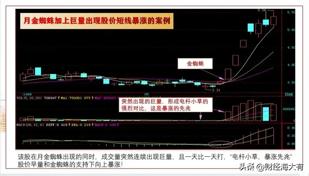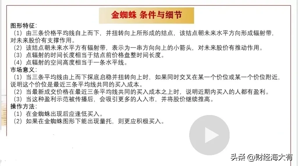 是5日、10日和20日均线黄金交又于一点,股价或指数站在交叉点之上的均线技术形态。像蜘蛛的身体,延伸的均线像蜘蛛的脚,向上就是“金蜘蛛”形态。