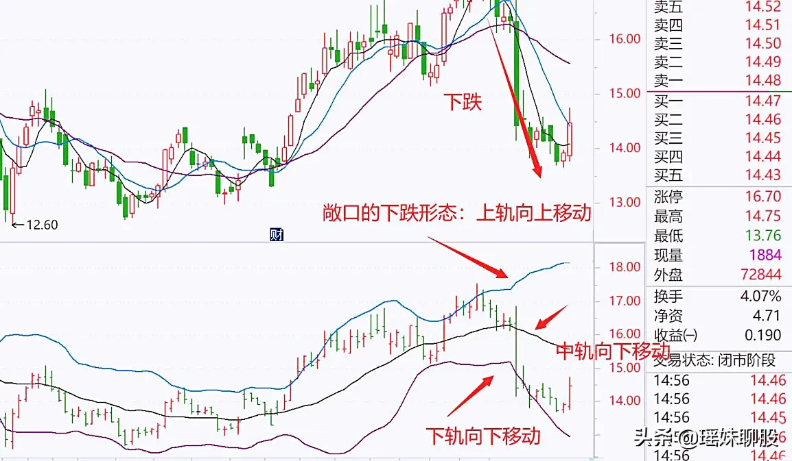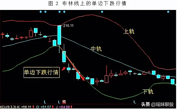3、当股价沿着布林线下轨运行时,此时的市场是单边下跌行情,而且通常是快速急跌,只要向下的走势没有逆转,千万不要轻易进场。