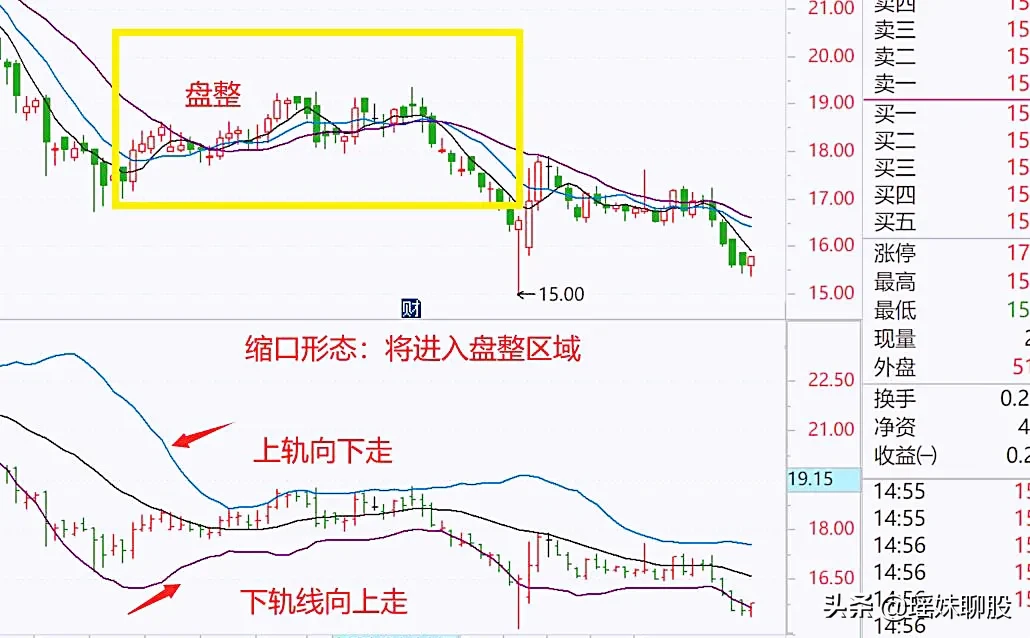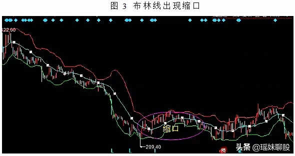 这里可以用极限宽指标来判断缩口的大小。公式如下:极限宽指标=(布林上限值-布林下限值)/布林股价平均值,当极限宽指标小于10的时候,股价随时可能向上突破。
