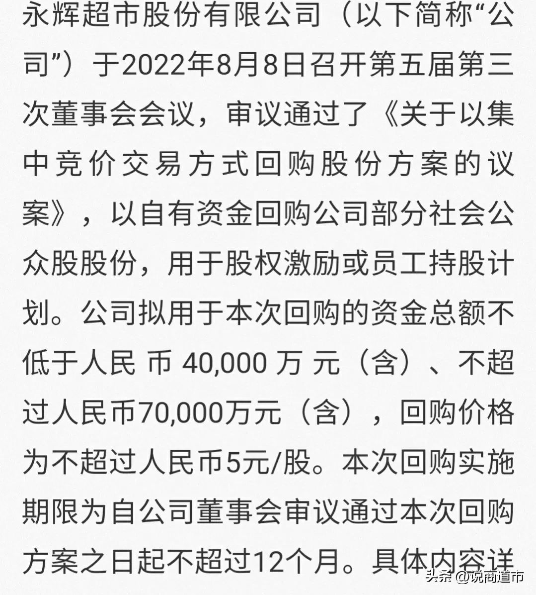 永辉刚刚发布公告称,此前公司曾拟以集中竞价的方式,回购4亿-7亿元股票,将在12个月内实施,回购价格为不超过5元/股,但截至8月底暂未进行。