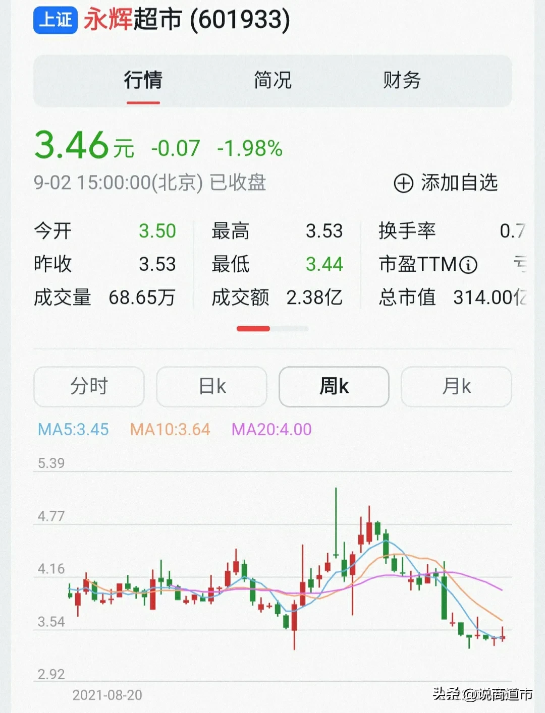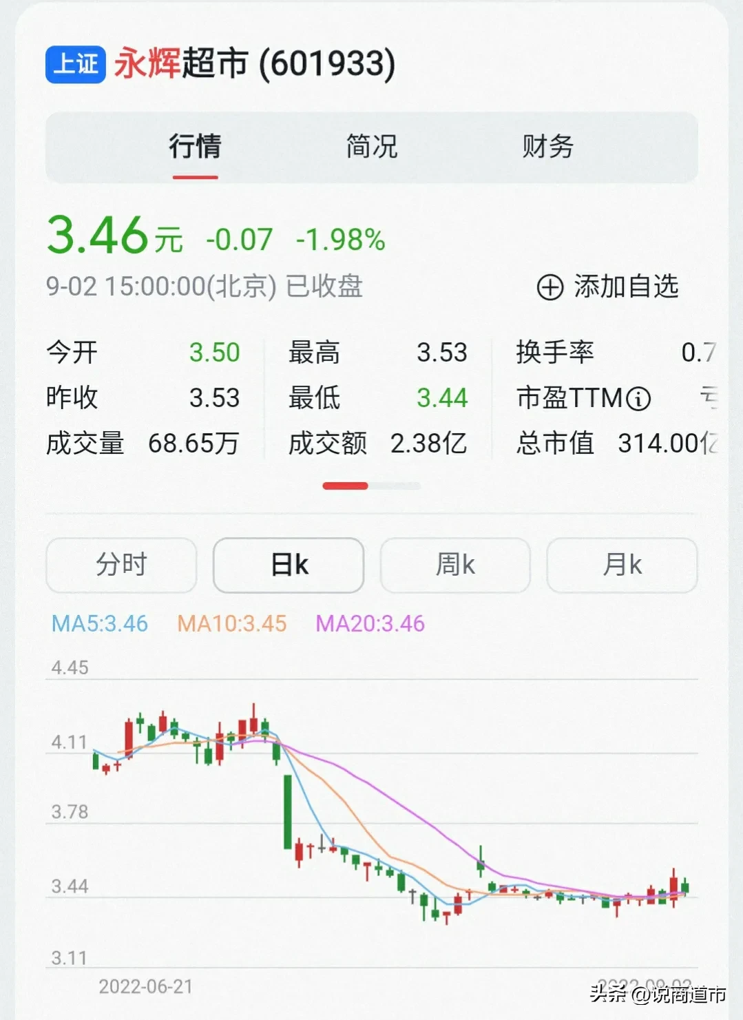 但2020年4月30日永辉摸高11元之后,便一路下跌,近期一直在3.4元区域徘徊,截至9月2日股价报收3.46元,市值相比最高峰时蒸发700亿元。