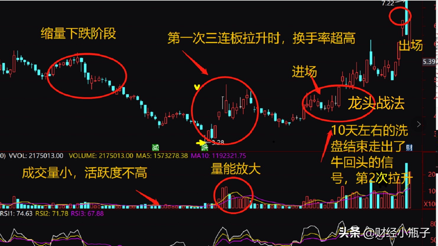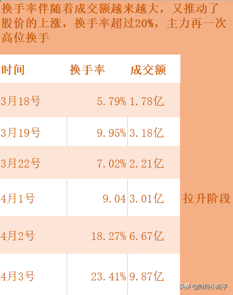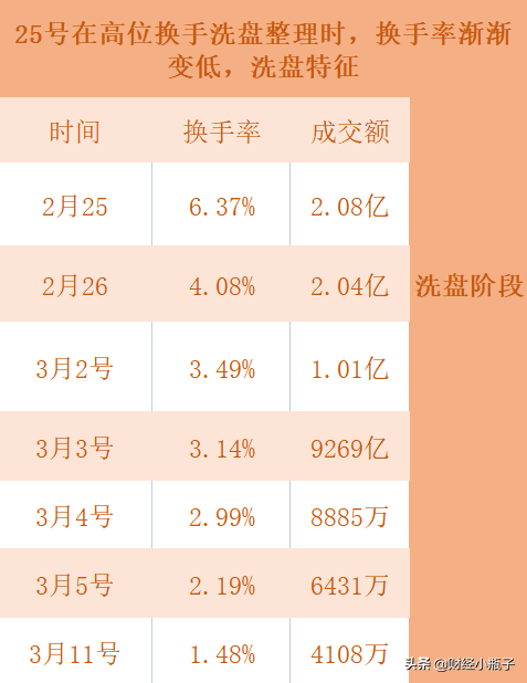 2月25号开始洗盘整理,期间换手率也比较低。在震仓洗盘阶段,股价连续回调到支撑位时且换手率小于2%,表明市场浮动筹码已少,换手率在很低的情况下代表主力洗盘即将结束了。