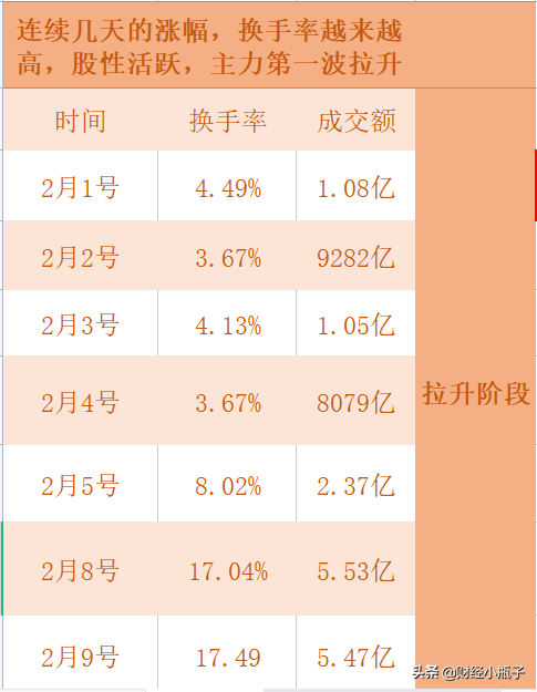 2月1号时该股突然跳空低开跌停,当天换手率4.49%,成交总额1.08亿。从诺大的成交额结合换手率可以看出有主力接盘的痕迹,神奇的是第2天直接拉涨停。当天换手率收出3.67%,而且后面连续几天换手率越来越高,直接向上跳空拉板,这个现象表明主力开始在低位运作了。