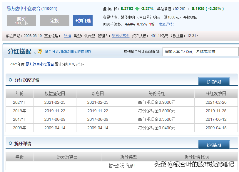 可见张坤对行情是有预见的,操作方法也没问题,涨多了的抱团股减仓,更有优势的集中持仓度。看看历史上易方达中小混合分红,总共就四次。这四次都有一个共同点,就是都是行情好的时候,换句话说就是基金赚钱的时候,而且今年分红是历史最高的,基本上可以预见目前是最好的时候。除了前十持仓,其余的都是一些小仓位,分散了风险。