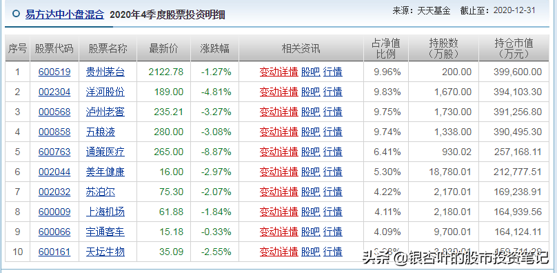 2020年3季度前十持仓70.25%,2020年4季度前十持仓67.39%。非常明显在整个基金市值占比前十是降低了持仓度了,但是去年4季度抱团股还是一个向上缓缓上涨的一个过程。前十里面一个行业里面龙头集中度更高,从3季度到4季度,茅台持仓上涨了约25%,五粮液持仓上涨了约22.75%;相对减仓了洋河股份,泸州老窖,分别减仓28%,10%。也就是说前十持仓在抱团股一个缓慢上涨过程中,总占比在减少,同行业持仓在高度集中到行业龙头。今年来,从最高点回撤洋河股份,泸州老窖分别30.99%,32.26%;茅台只有21.33%,五粮液24.33%。
