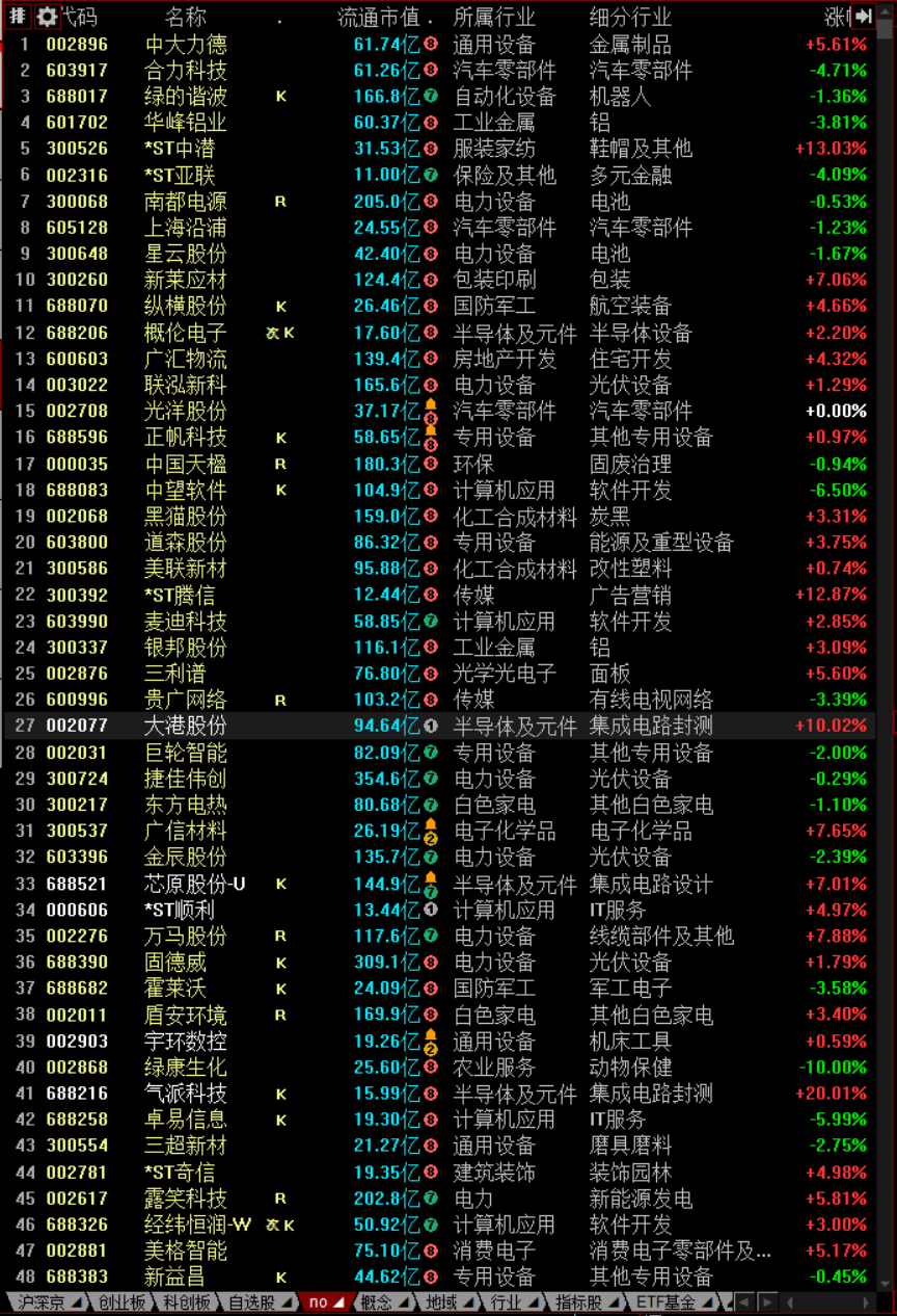 市场上较强的几个票,大港股份,康强电子,奥维通信,金石资源,东尼电子,南都电源,沐邦高科。黑马, 通达动力。
