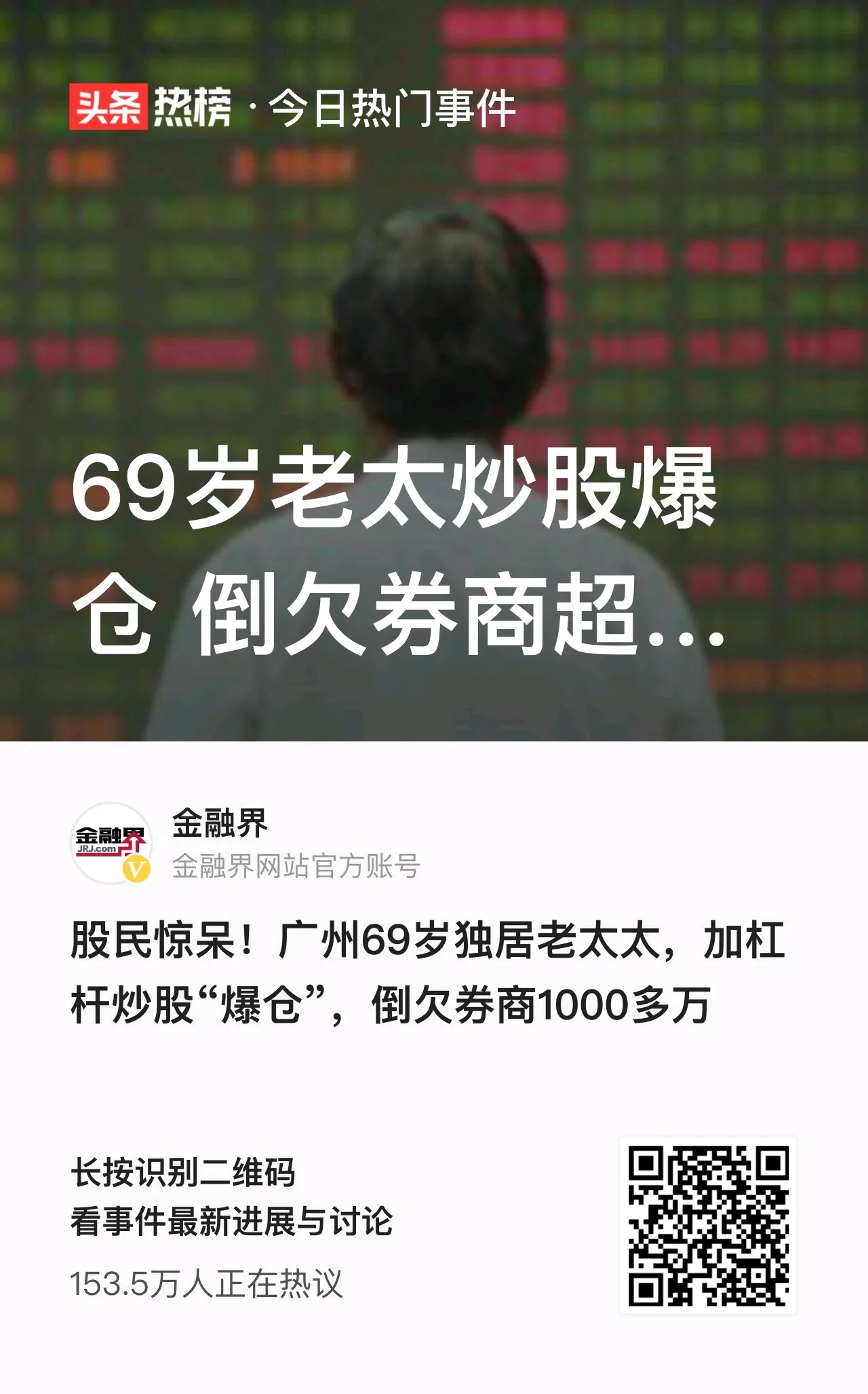#69岁老太炒股爆仓 倒欠券商超千万# 近期中国裁判文书网披露的一则判决书显示,广州一名69岁老太加杠杆炒股,中信建投证券居然能给其授信6600万元的两融额度。在股票跌破平仓线后,老人没有在约定时间内追加担保物或偿还债务,最终,数千万的股票被强平后,还要清偿中信建投证券逾1000万元的债务。这个事情双方都有责任,当然最大的责任还是在这位老人。一位年近70的老人,为什么还要玩加杠杆炒股呢?这是一个风险极大的投资,需要有深厚的相关专业知识才行。这样一个年龄老人,又不是这一行的专业人员,怎么能介入这样的行为呢?券商公司也不应该给这样的老人如此高的额度,这简直是在坑人啊!
