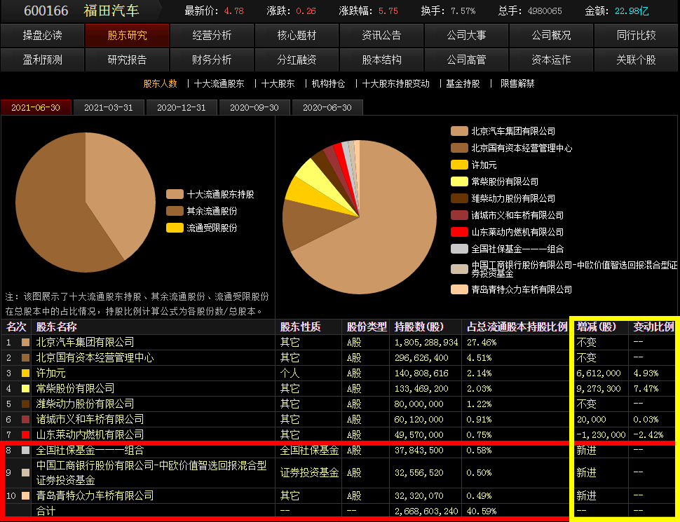 大股东还有加仓行为,十大股东第三第四大股东加仓福田汽车!