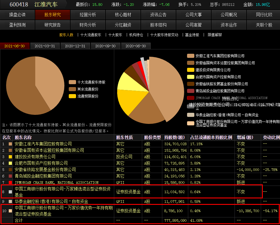 从江淮的持仓股东来看,工商银行万家臻选,万家价值跟福田的持仓大股东是一个体系的同等操作!
