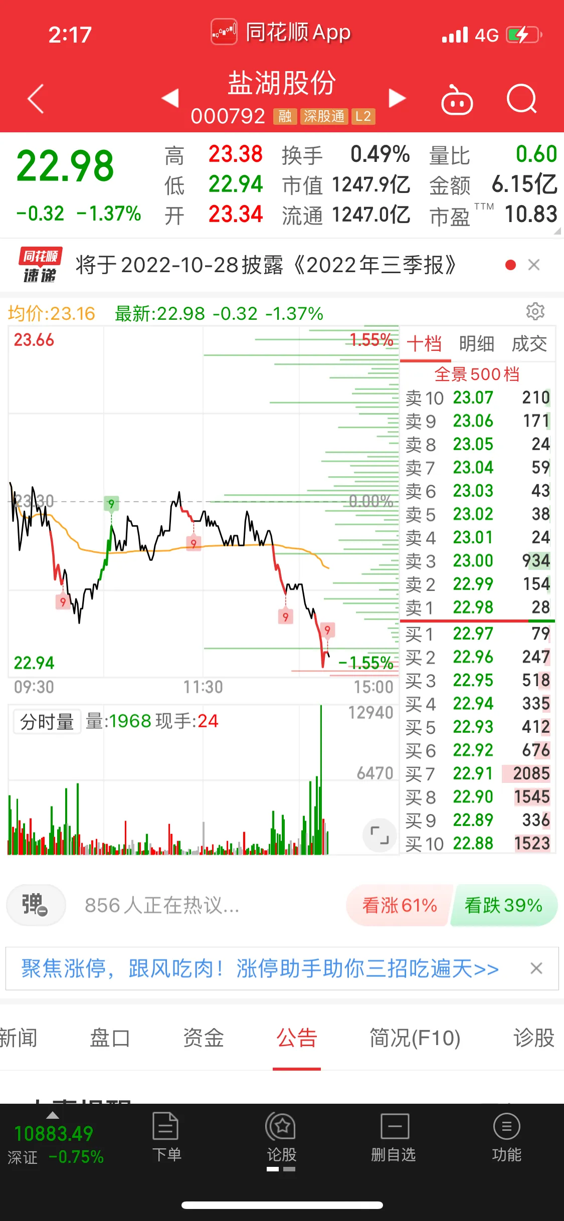 第三只是盐湖股份,他九月份买的,而且是借的网商贷买的,买入均价25左右,现在股价23块。