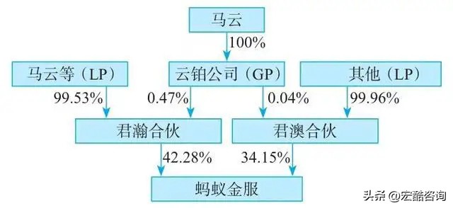 控制权:蚂蚁集团最大的股东是君瀚和君澳两家合伙企业,而这两家企业GP是杭州云铂投资公司担任,GP占小股也有100%控制权,杭州云铂投资是马云全资控股。