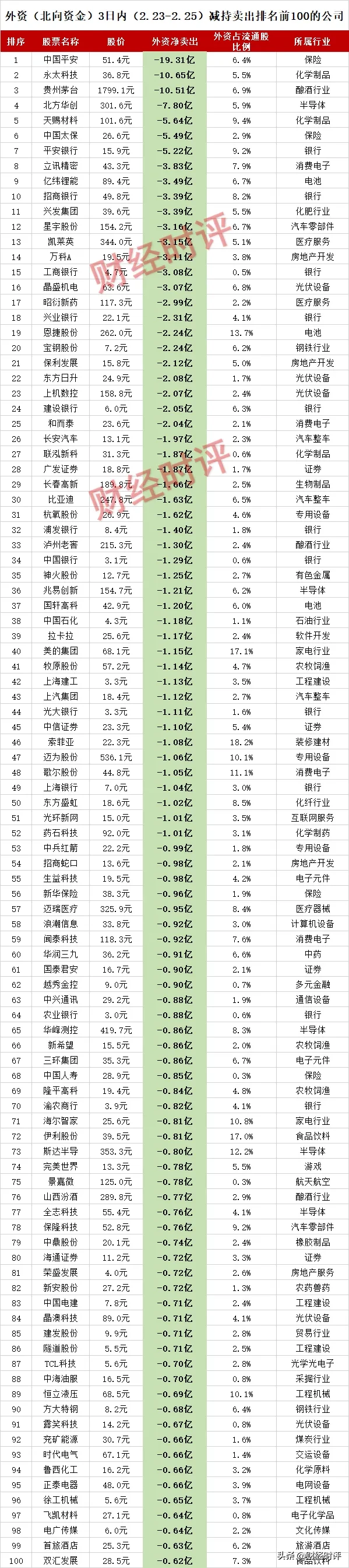 【外资(北向资金)3日内(2.23-2.25)减持卖出排名前100的公司】