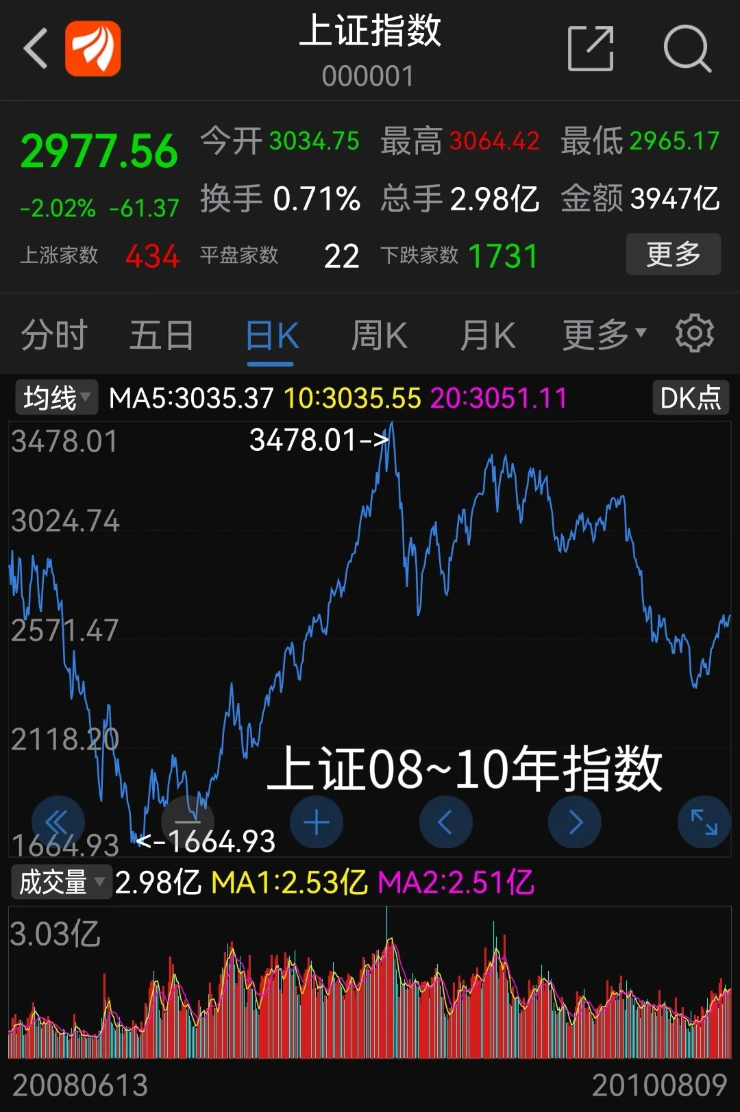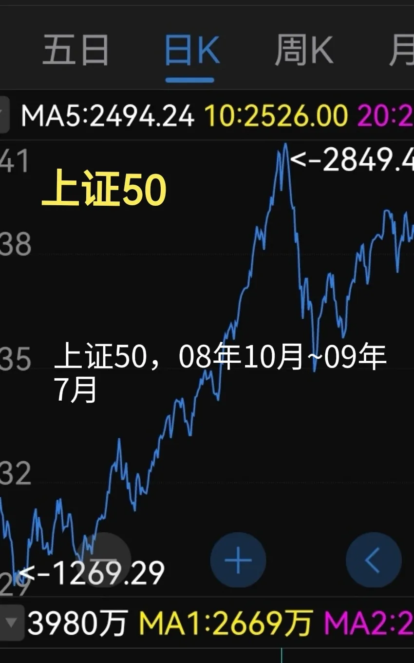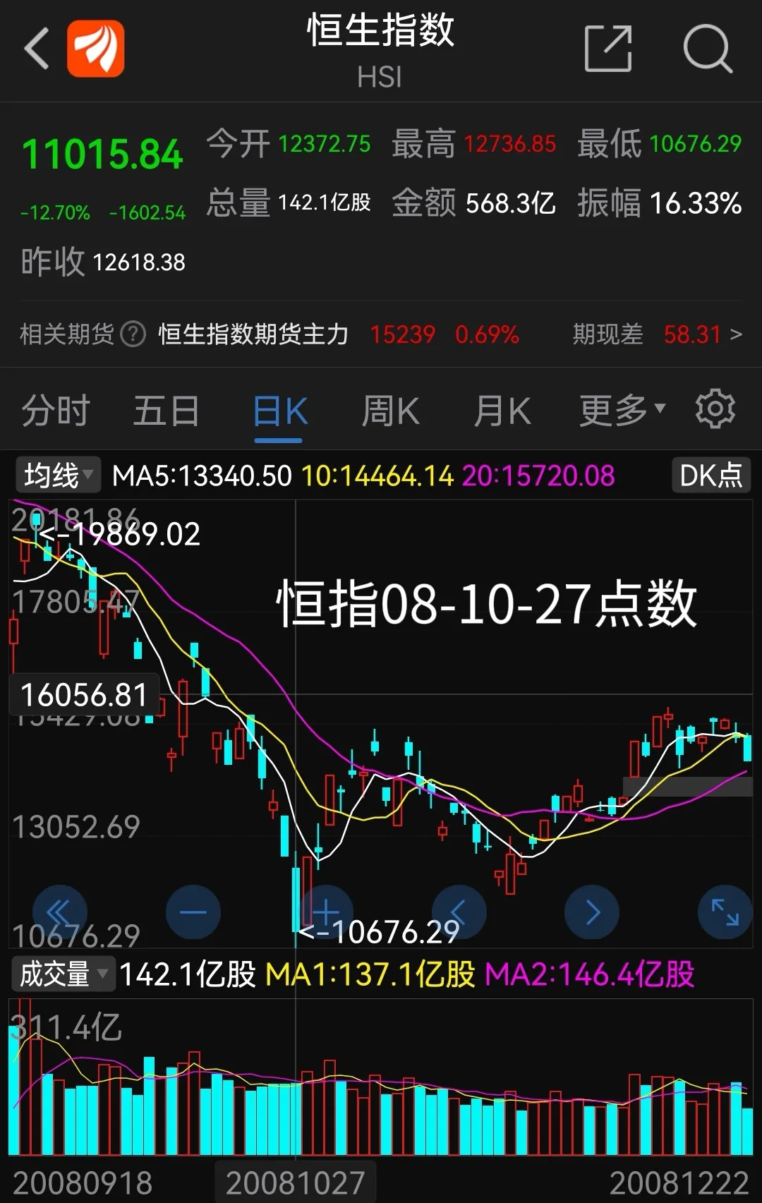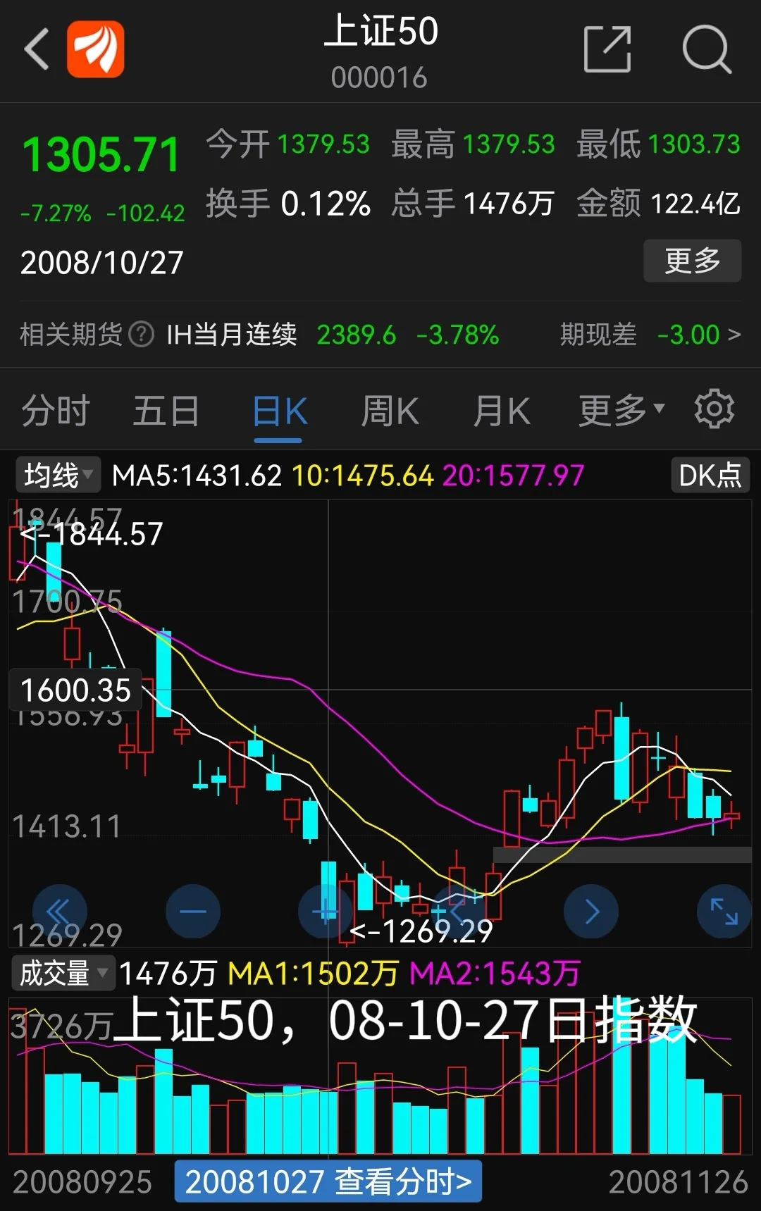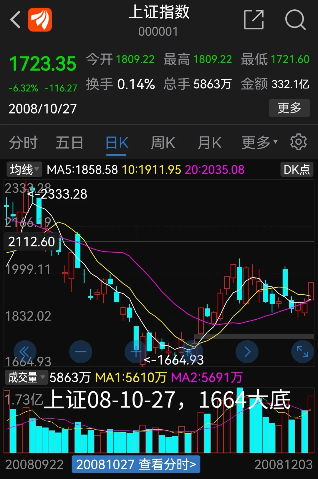 现在的情况下,怎么办?能出抄底不?答案是: 且等片刻!翻看一下08年10月27日的K线图,当日上证跌6.32%,报收1664点,探到了阶段大底。而上证50更是跌7.27%,恒指最为惊恐,跌12.7%。巧合是的当日是农历的九月廿九,而今天也是农历九月廿九。但前者公历是10月27日,而今天是公历10月24日,日子还没到齐。等到哪天的跌幅比今天更大,就基本上可以判断为阶段支撑点了。