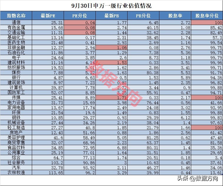 股息率分位最好的分别是通信(100%)、传媒(100%)和轻工制造(100%)。