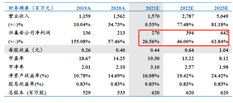 预计2021-2023年公司收入为15.7/27.87/50.49亿,净利润2.7/3.94/6.42亿,同比增速为26.56%/46%/62.84%,首次覆盖,给予“买入”评级;