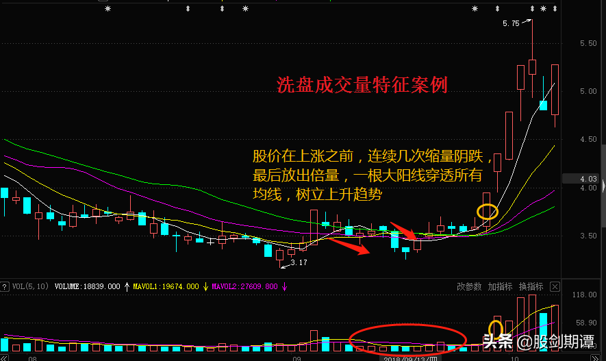 洗盘的成交量特征是缩量,随着股价的破位下行,成交量持续不断地萎缩,常常能创出阶段性地量或极小量。